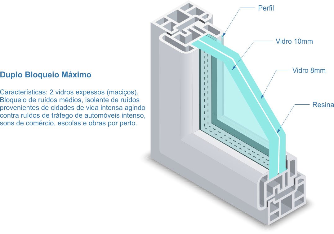 Indicado para locais barulhentos de nível médio, porém constantes, tais como: trânsito intenso, sons alto de festas, latidos de cães, fábricas e comércio por perto. Composição de janelas acústicas com vidros duplo bloqueio: 01 vidro de 10mm + 1 Resina + 1 vidro de 8mm - Total 18mm.